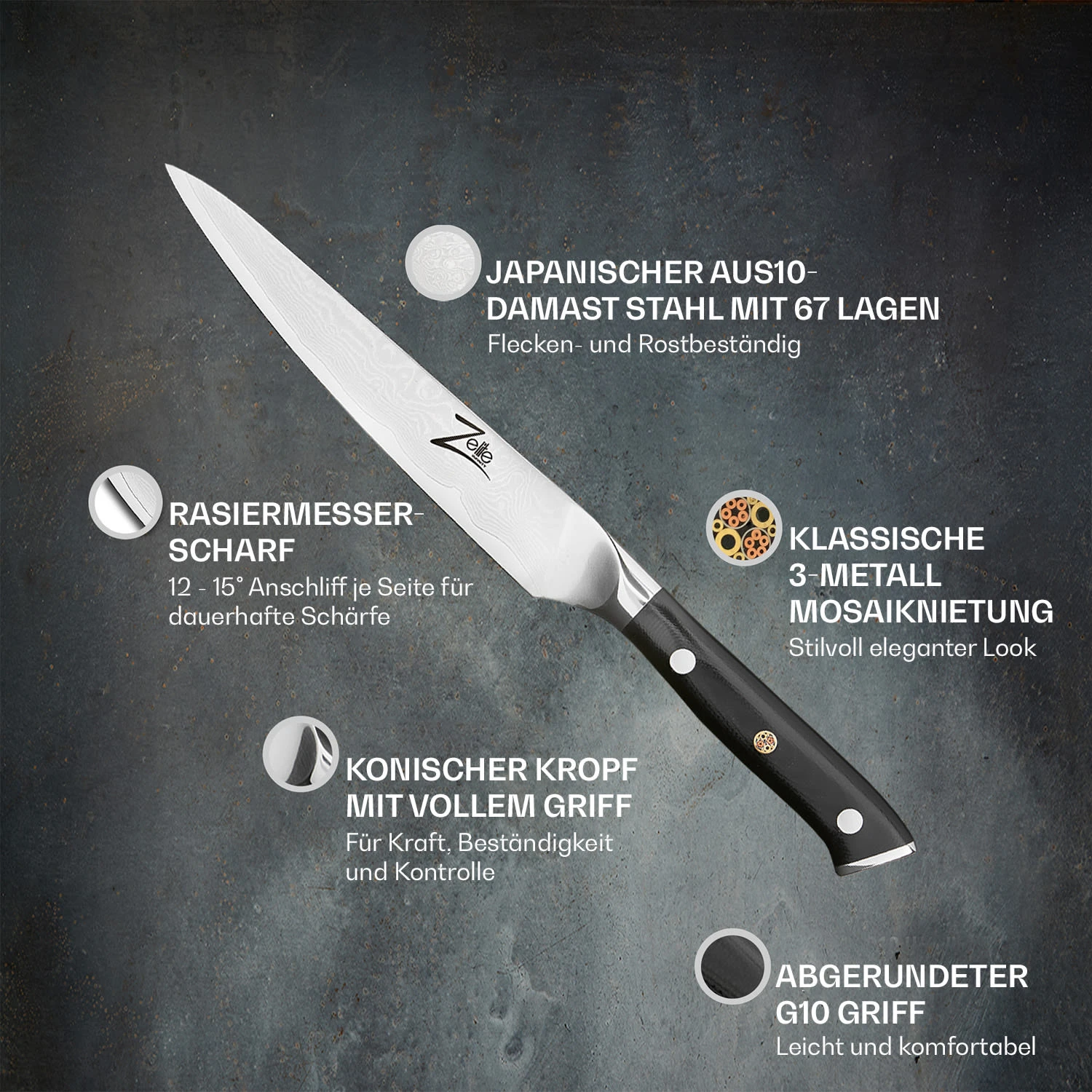 - mit 3-Metall-Mosaikniete in der Klinge