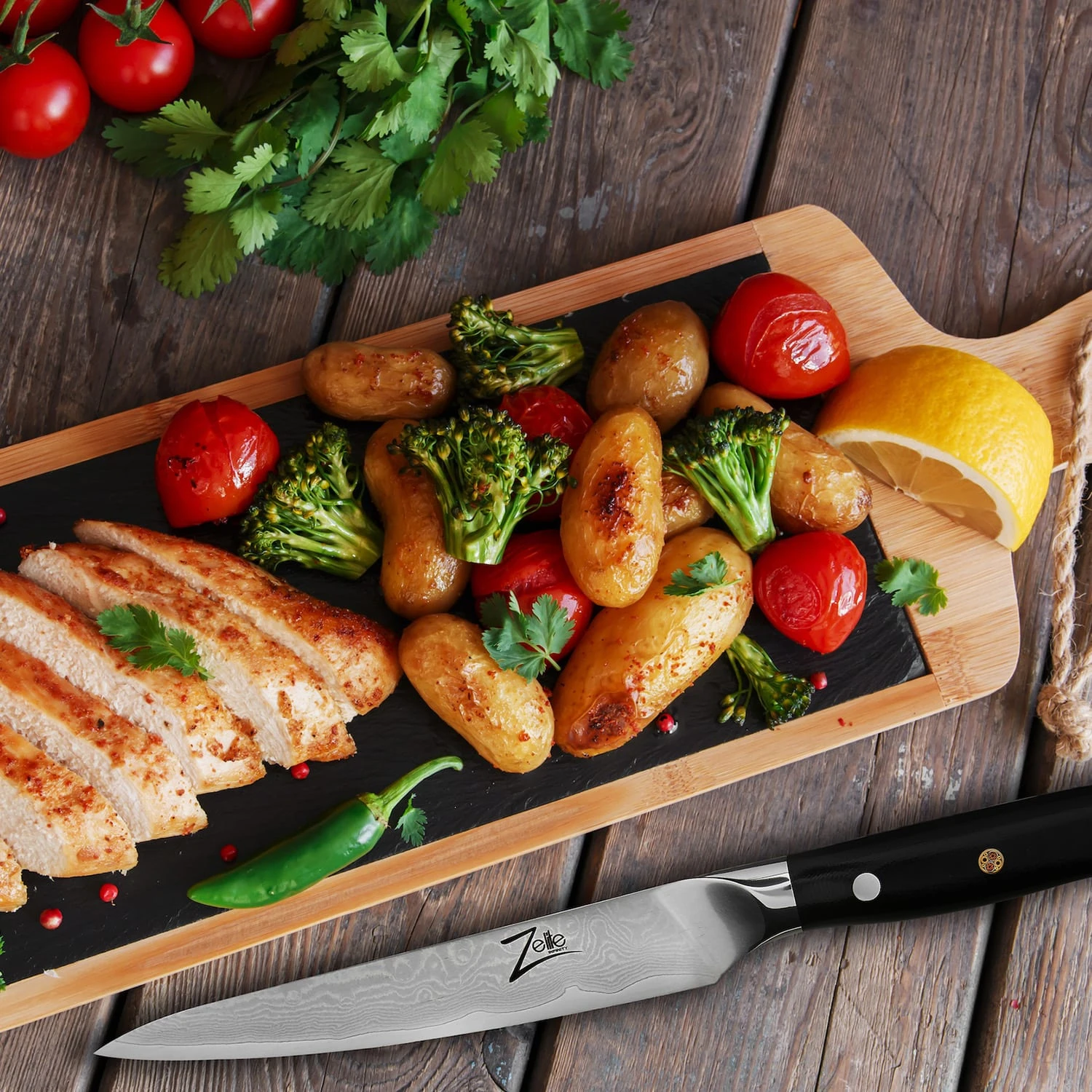 Exklusive Präzisionsmesser nach japanischem Vorbild: Die handgeschliffene Zelite Infinity by Klarstein Alpha-Royal Japanese Messerserie erfüllt hohe Ansprüche bei jeder Kochkunst. Insgesamt 67 Schichten bilden als hochwertiger, japanischer Damaszener-Stahl übereinanderliegend die changierende Klinge. Durch eine perfekt ausbalancierte und ergonomische Formgebung und einen nahtlosen, dreifach vernieteten Griff aus G10-Glasfaser liegen die eleganten Küchenwerkzeuge wunderbar in der Hand. Hier verbinden sich Schärfe, Haltbarkeit, Gewicht, Kontrolle und Handhabung mit außergewöhnlichem Design, perfektioniert durch eine kunstvolle 3-Metall-Mosaikniete im Griff.