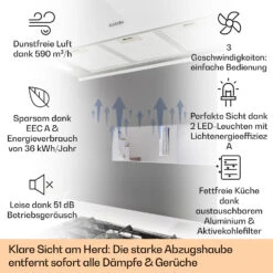 Antonia Dunstabzugshaube Kopffrei 90cm 350m³/h Touch-Bedienfeld Glas