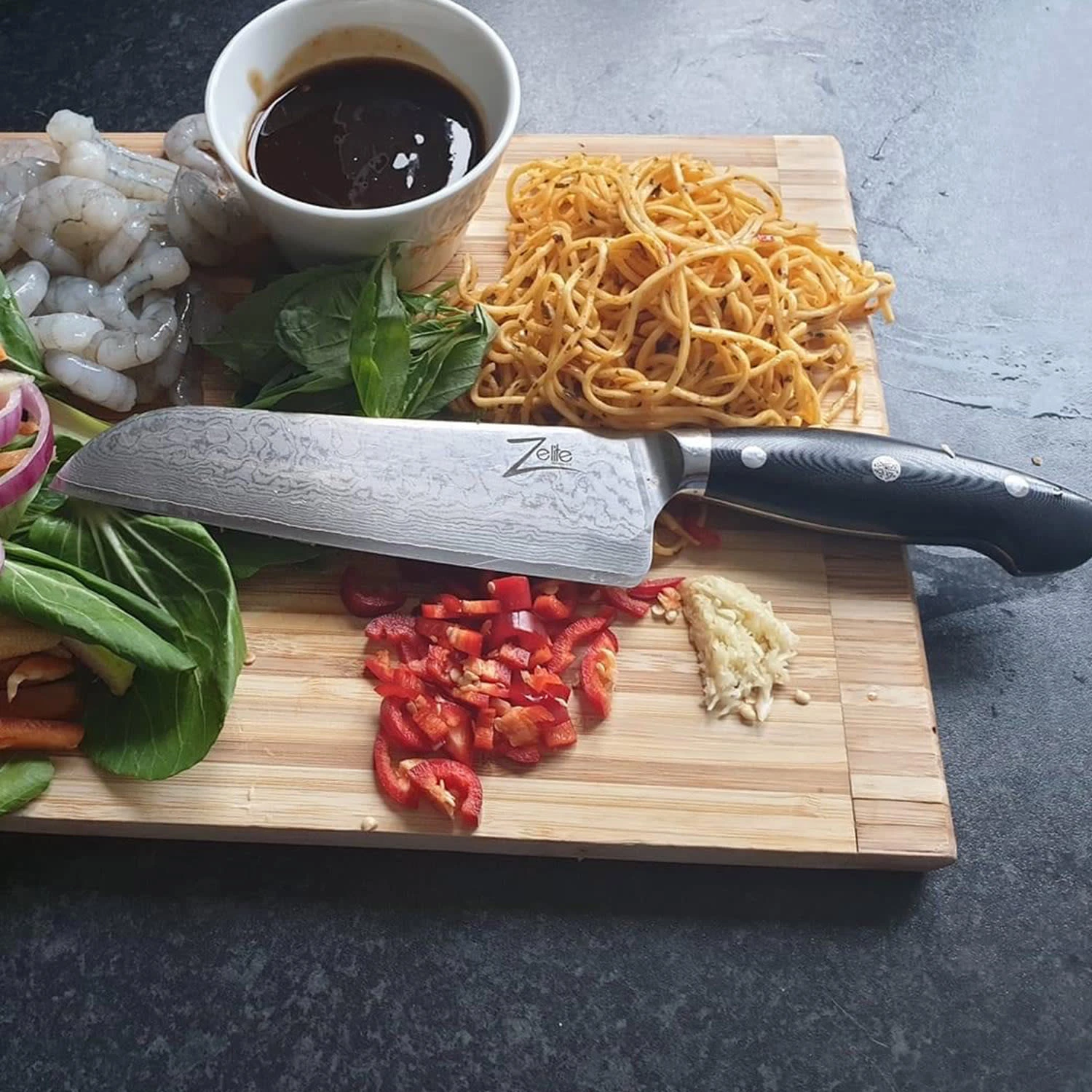 Unser Santokumesser der Executive-Plus Serie von Zelite Infinity by Klarstein besitzt eine 45-lagige Damastklinge und einen gebogenen Bauch. Es ist ist ein echter Hingucker und perfekt zum Hacken, Schneiden und Würfeln von Obst, Gemüse, Fleisch ohne Knochen und Fisch geeignet. Die breite Klinge eignet sich ideal für den Transport von zerkleinerten Lebensmitteln. Durch den ergonomischen G10-Griff mit Buckelrücken gestaltet sich die Zubereitung von Speisen präzise, effizient und vor allem bequem.