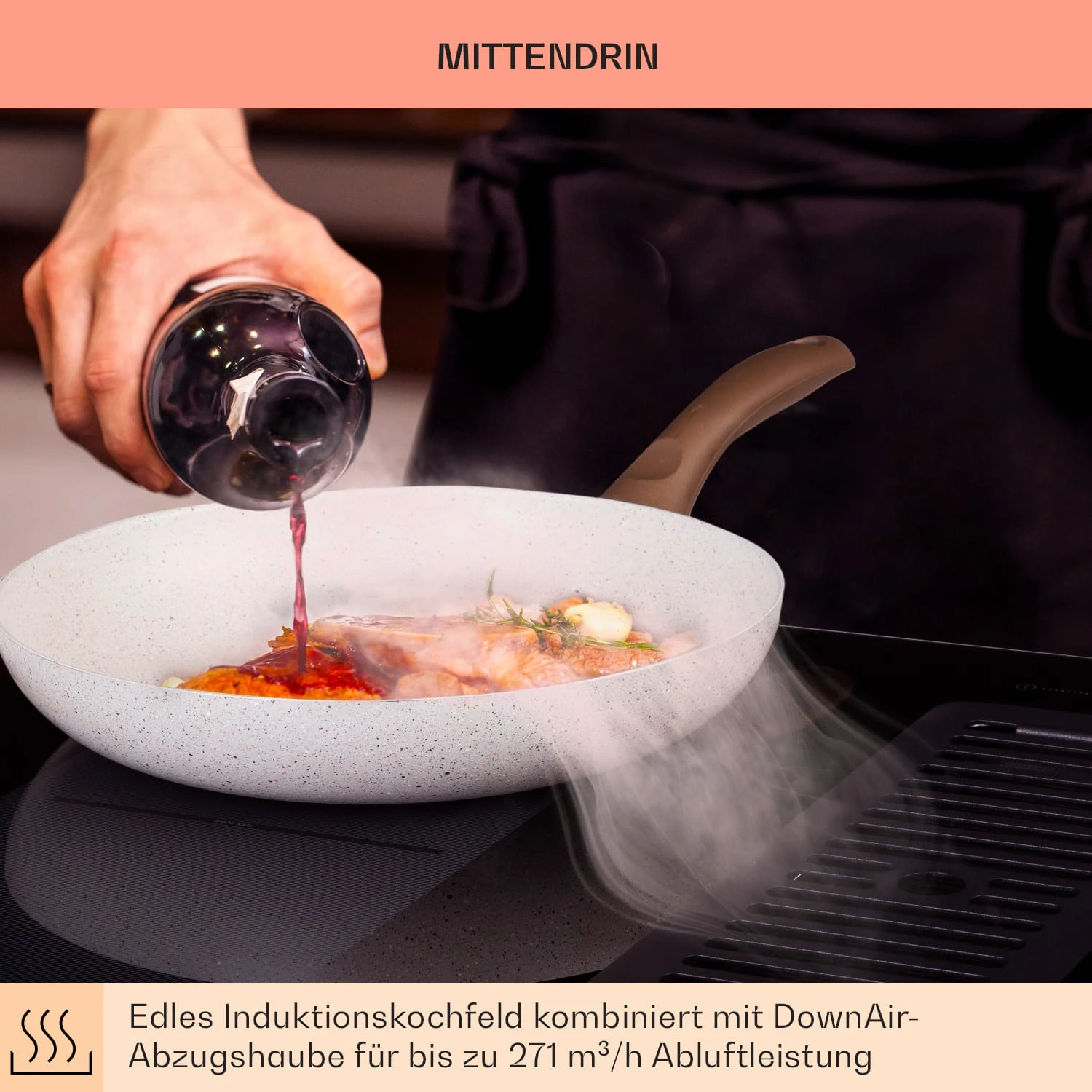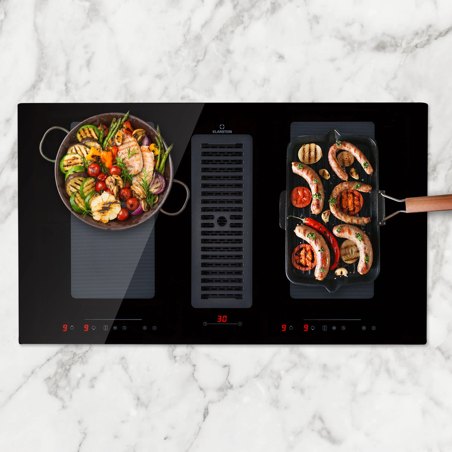 Mittendrin statt nur dabei: Das Klarstein Full House DownAir System revolutioniert deine Küche! Es kombiniert sein Induktions-Kochfeld direkt mit einer DownAir Abzugshaube. So verschwinden Küchendampf und -gerüche direkt dort, wo sie entstehen.